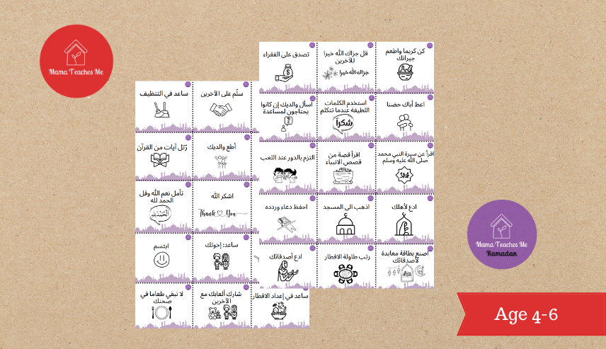 Download our Arabic FREEBIE (as translated by Abeer) Cut along the dotted lines to create 30 good deed cards. You can use these in a Ramadan calendar, on a Good Deed’s chart or peg them up daily. The good deeds are ideal for children aged 4-6.
