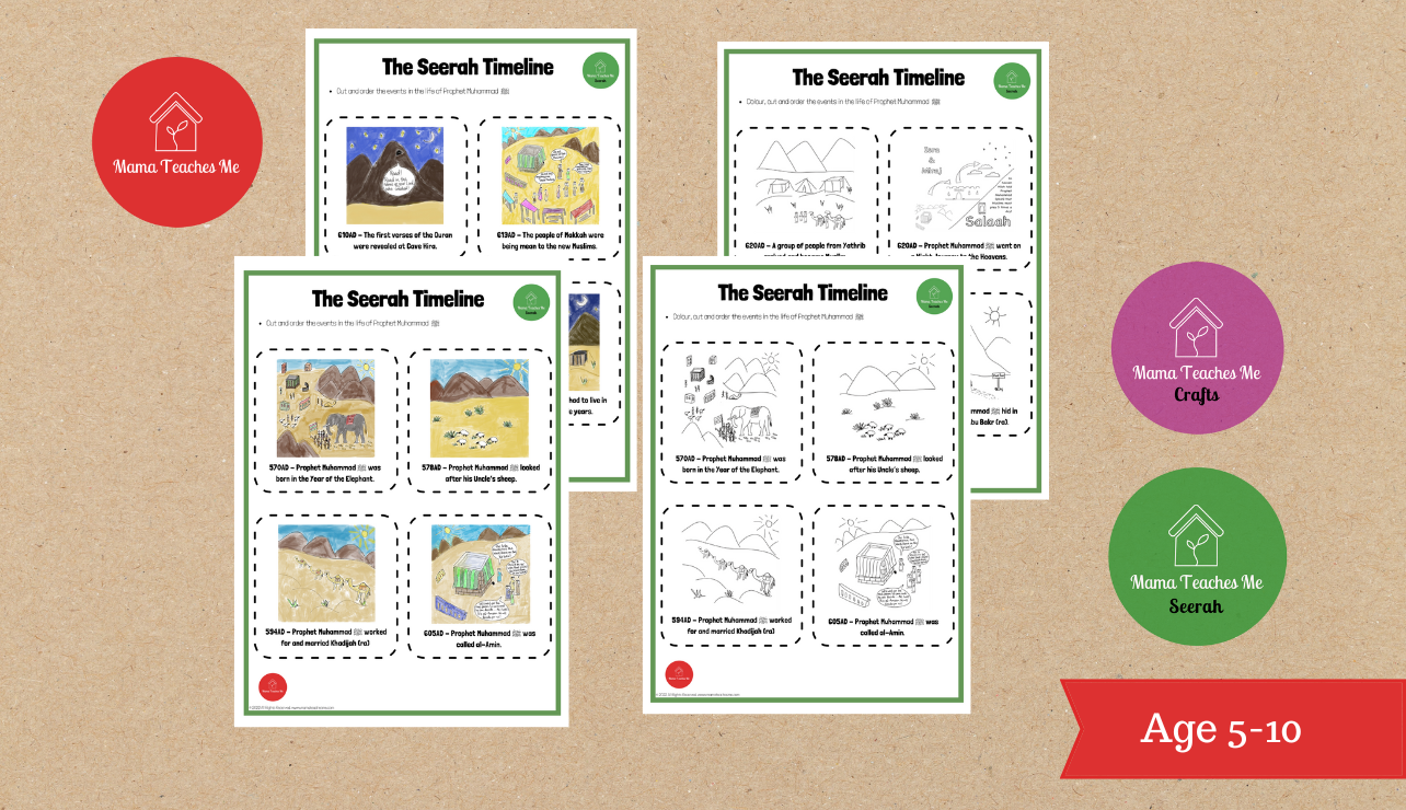 Teach your children about our beloved Prophet Muhammad (pbuh) with a timeline from the Seerah of the Prophet Muhammad’s (pbuh) major events of his life. This timeline (with dates) allows your children to order and become familiar with the major events in the life of Prophet Muhammad (pbuh). As they learn more about the Seerah they can continue to add to their timeline too. This resource is aimed at children aged 5-10 and includes a black and white version of the timeline too.